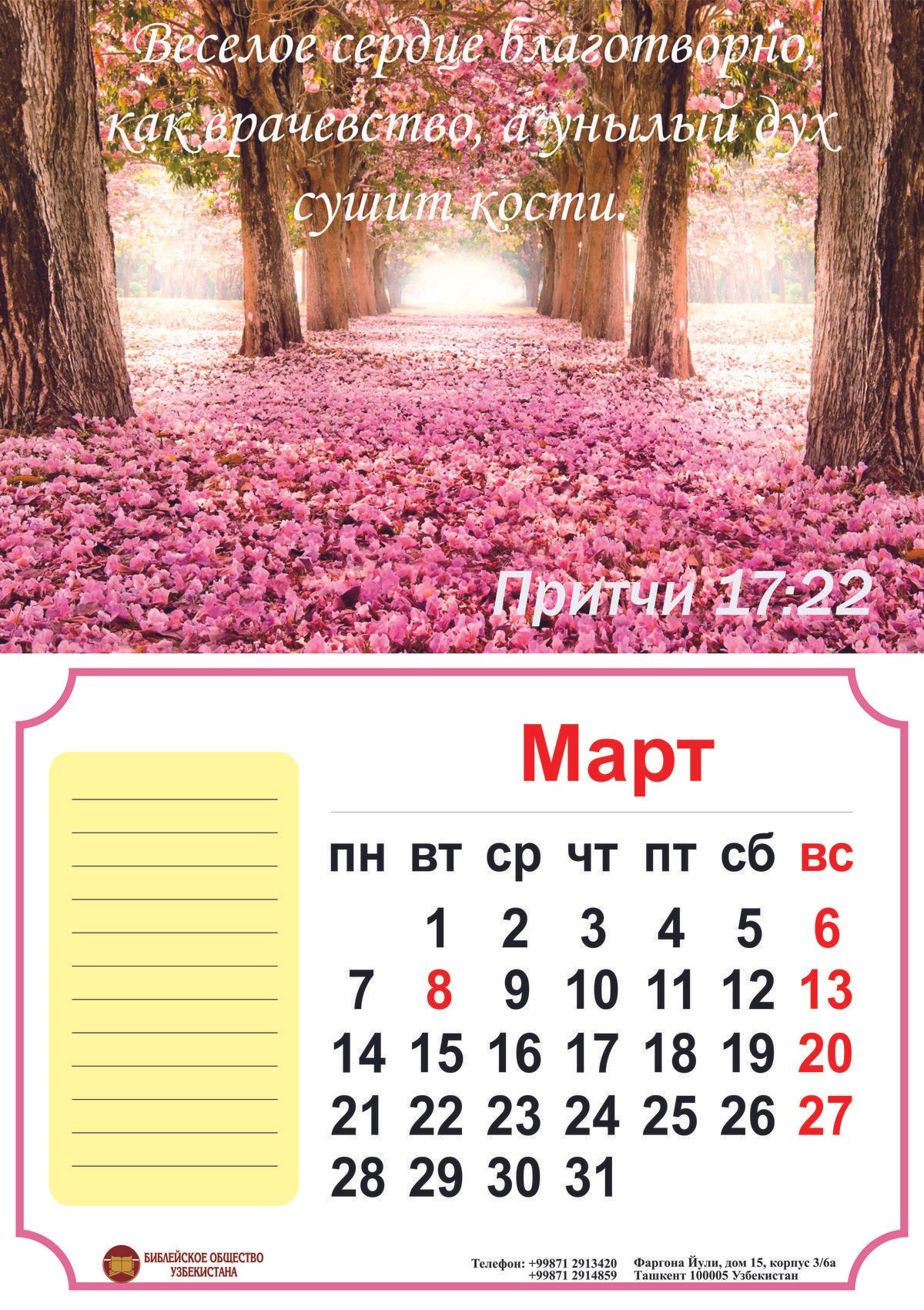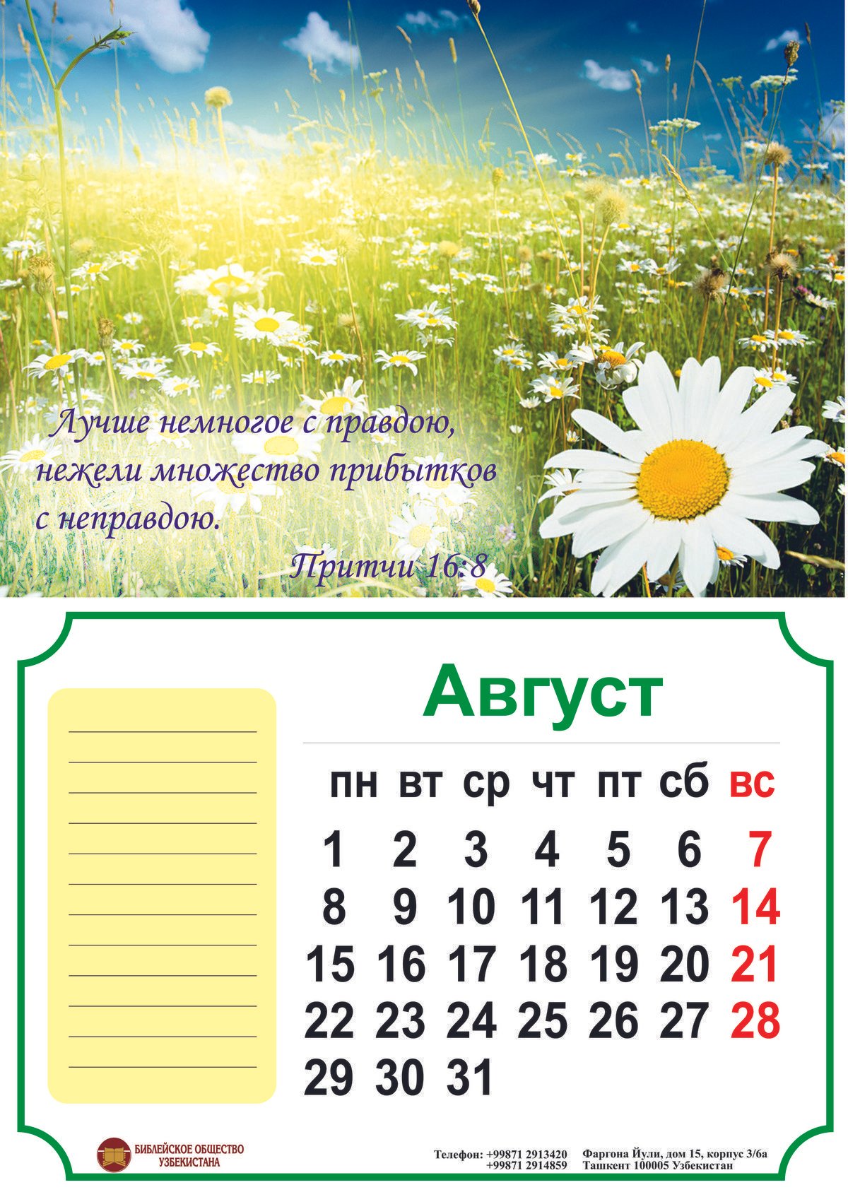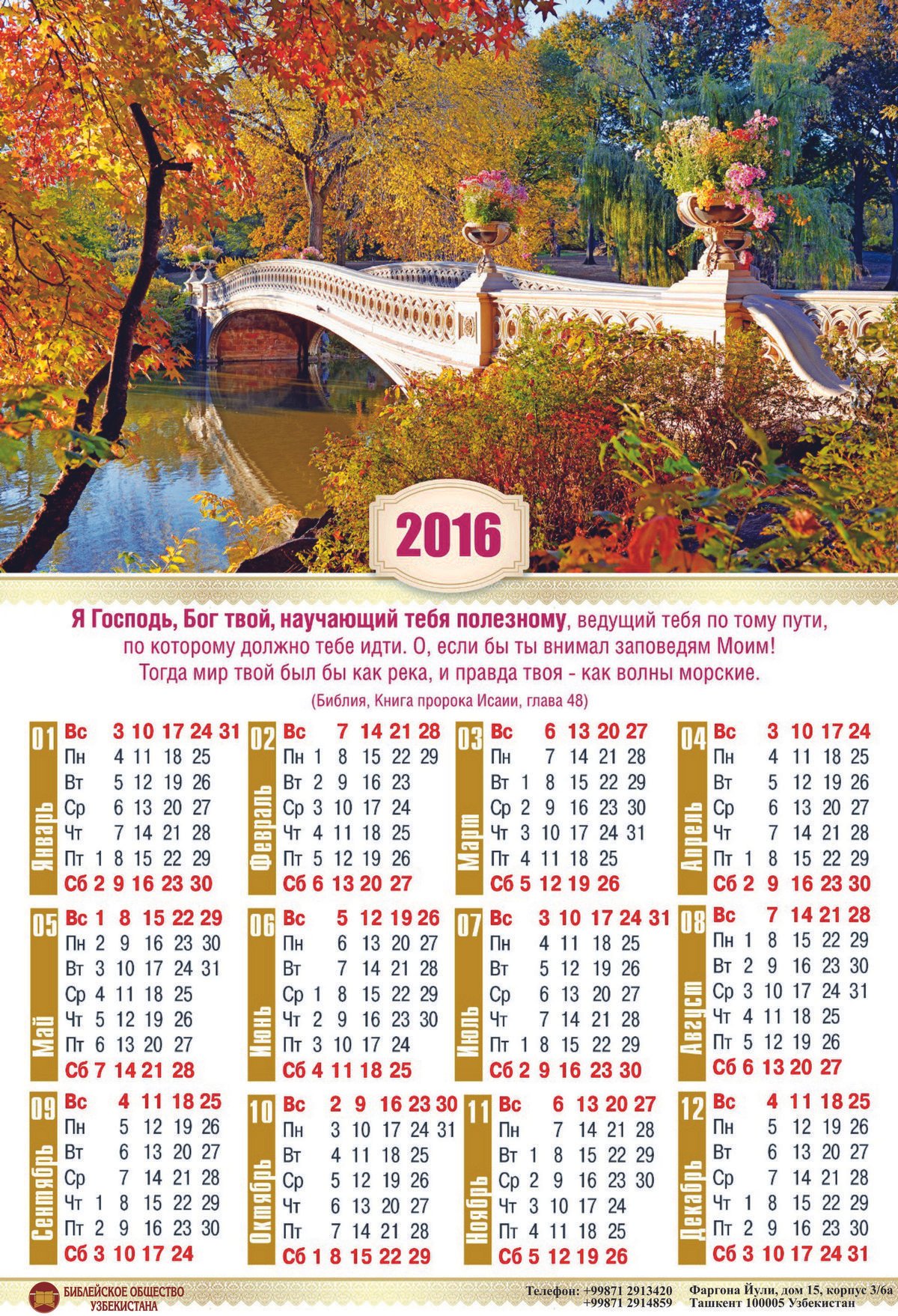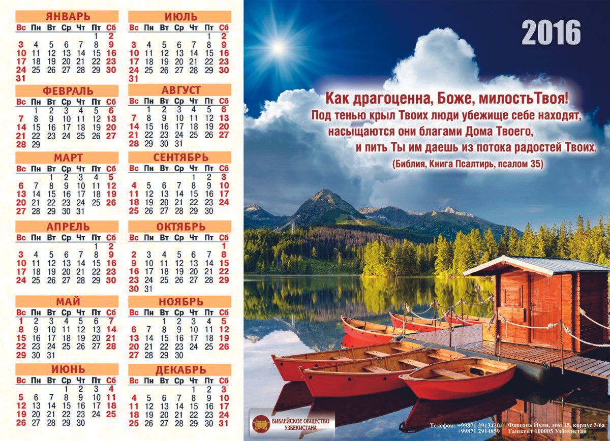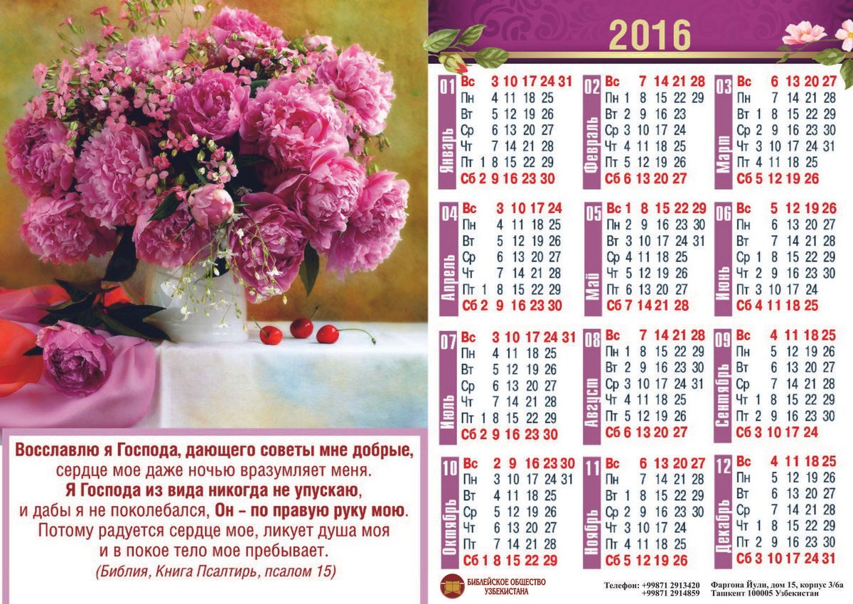 Дорогие друзья! В Библейском обществе появились календари на 2016-й год! Календари представлены в трёх видах: Простые листовые, Перекидной и Квартальный. Эскизы Вы можете посмотреть ниже.